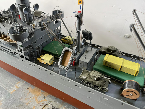 This model of a WWll Liberty ship is complete with battery, ballast and radio. It also includes various deck cargo items eg tanks, trucks, jeeps and a number of crates. The model is 1380 mm LOA. Priced £600. 07798 786076